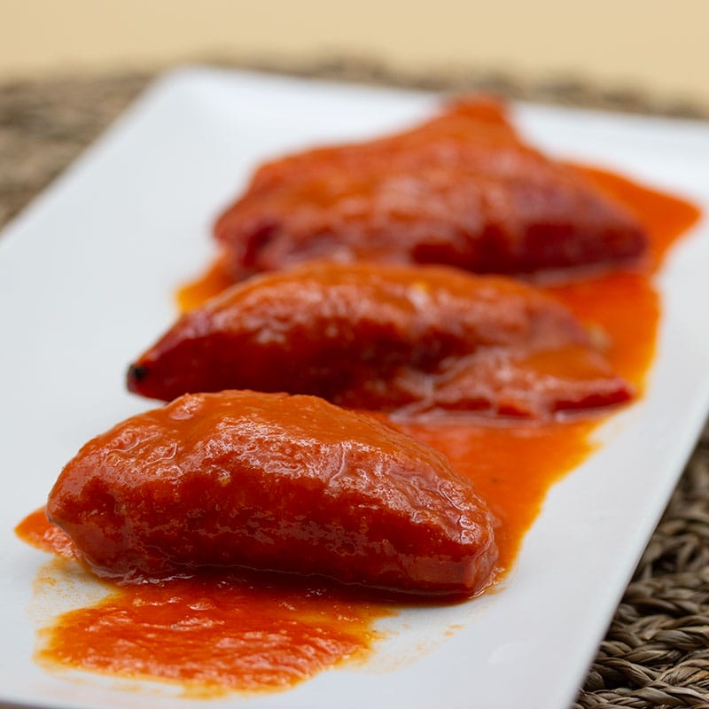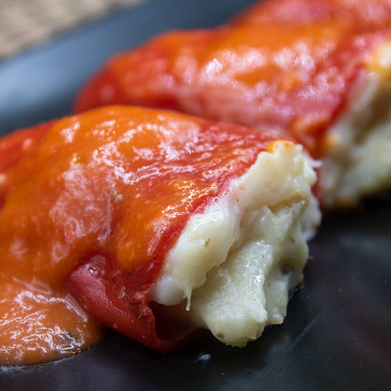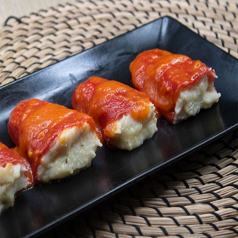 El Pimiento Relleno de Bacalao en Salsa es la perfecta conjunción Mar-Huerta. El Pimiento de Piquillo contiene una mezcla de Bechamel casera con Bacalao y viene acompañado de una salsa de Tomate que redondea el plato a la perfección. Es un delicioso plato principal. ¡Nuestros Pimientos Rellenos de Bacalao en Salsa irán directos a tu lista de favoritos!